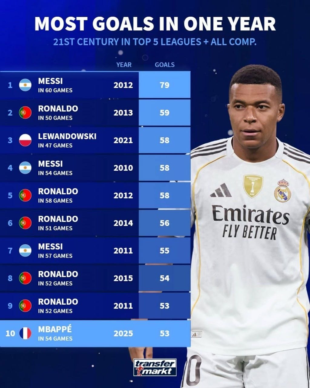 کیلیان امباپه با ثبت ۵۳ گل در ۵۴ بازی در سال ۲۰۲۵ وارد فهرست برترینهای یکساله شد و جایگاه دهم را به خود اختصاص داد که نشانه ورود نسل جدید به مقیاس رکوردهای بزرگ است. این آمار نشاندهنده سازگاری او با فشارهای سطح بالا و بهرهگیری از فرصتهای متعدد است. مقایسه عملکرد امباپه با اساطیر پیشین کمک میکند تا مسیر او در سطح تاریخ فوتبال ارزیابی شود. قرارگیری او در این جدول نویدبخش رقابتهای آینده و ادامه روند تحول در شاخصهای گلزنی است.