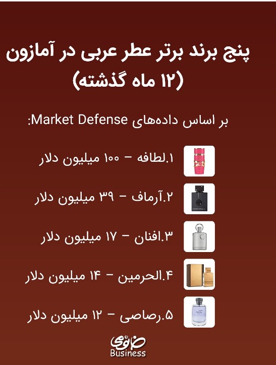 سال ۲۰۲۵، برندهای عربی در صدر پرفروشهای آمازون قرار گرفتهاند. لطافه با فروش ۱۰۰ میلیون دلار، پیشتاز است و آرماف، افنان، الحرمین و رصاصی در رتبههای بعدی قرار دارند. این موفقیت نشاندهنده علاقه جهانی به رایحههای خاورمیانه است. مصرفکنندگان به دنبال عطرهایی با کیفیت بالا و ماندگاری طولانی هستند. jetbet90